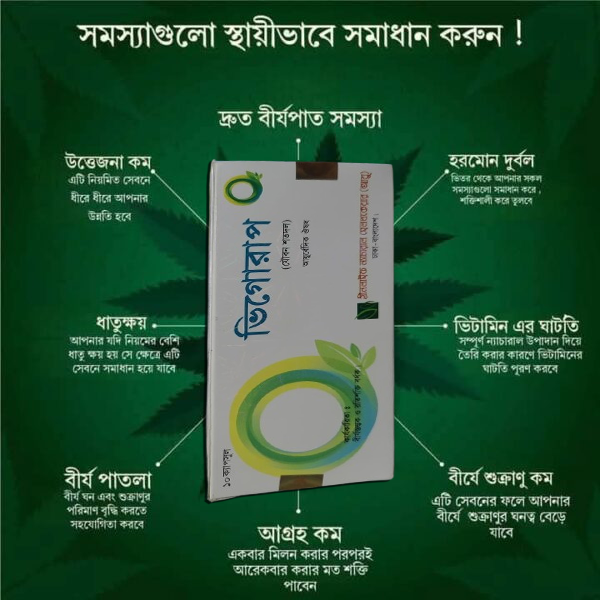 এতে পরিপূর্ন সুস্থ হবেন এবং ৩০ থেকে ৪০ মিনিট সহবাসের সময় বৃদ্ধি হবে। প্রতিদিন ১টি করে ভিগোরাপ ও সহবাসের আগে একটি জিনসিং সেবন করবেন।